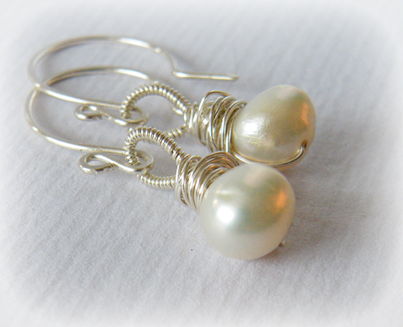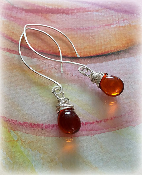 Peach czech glass teardrops wrapped in sterling silver wire.