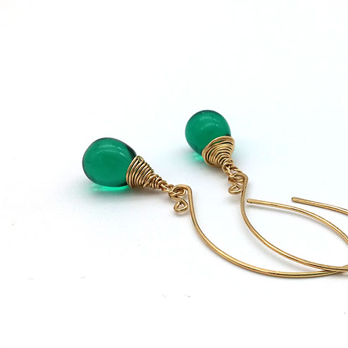 Teal green czech glass teardrops wrapped in gold filled wire.