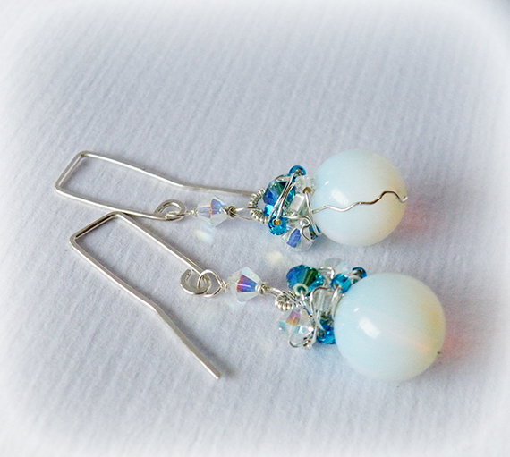 Moonstone czech glass teardrops wrapped in gold filled wire.